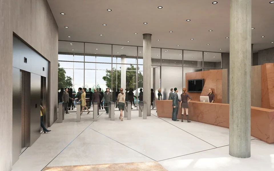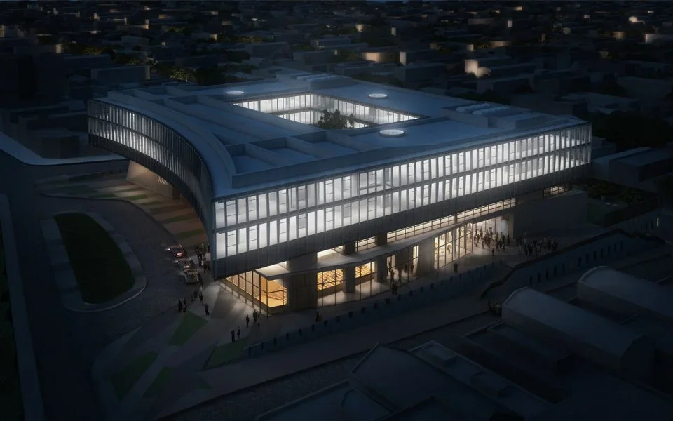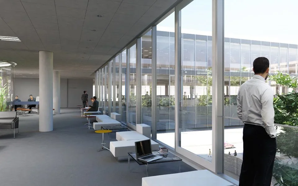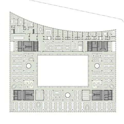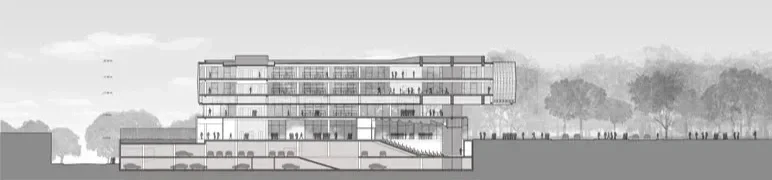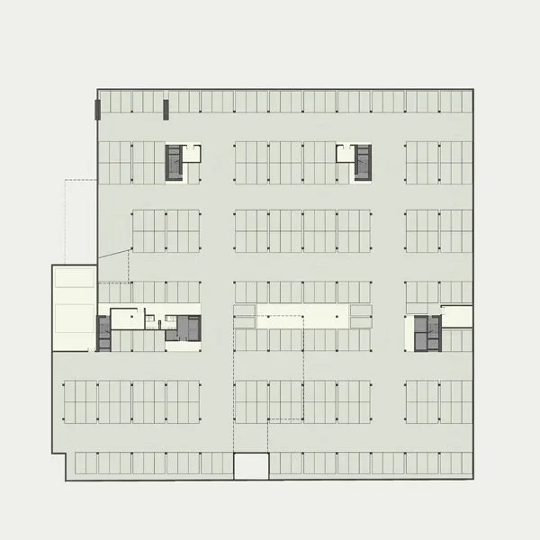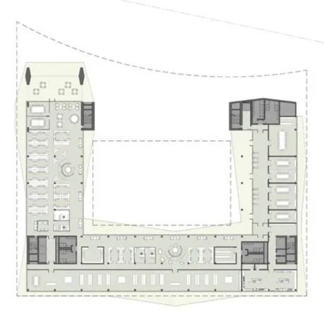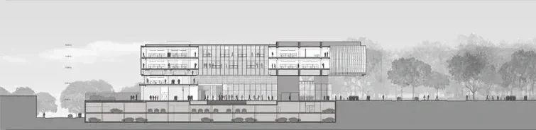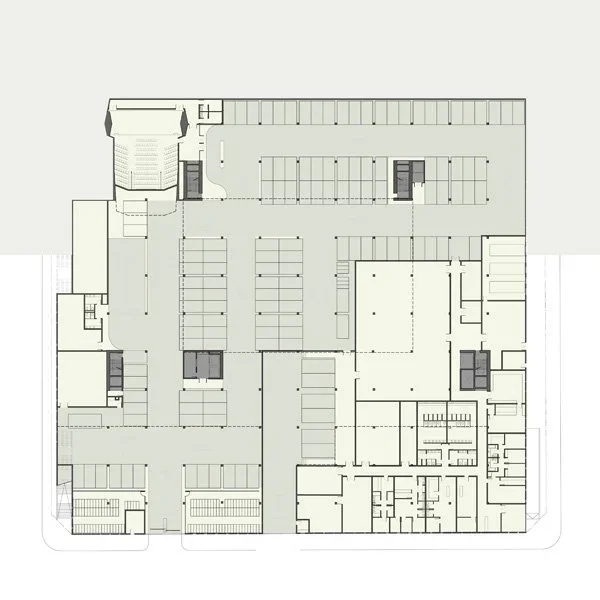Across the street from Parque Patricios, a large urban park in Buenos Aires, the site for the new Banco Ciudad headquarters boasts an iconic location. The design proposal takes advantage of this unique condition, creating an approach sequence that includes an entry plaza, a central patio, and a generous garden that extends the park into the interior of the urban block. Below this outdoor plan, two levels carve into the site’s natural topography as it slopes away from the park toward the south, creating a podium under the building that houses parking, a service area, and VIP entrances to the auditorium at the street level. Above, the primary entrance—as well as more public programs such as an auditorium, a bank branch, a social lounge, and a gym—occupy the ground level.