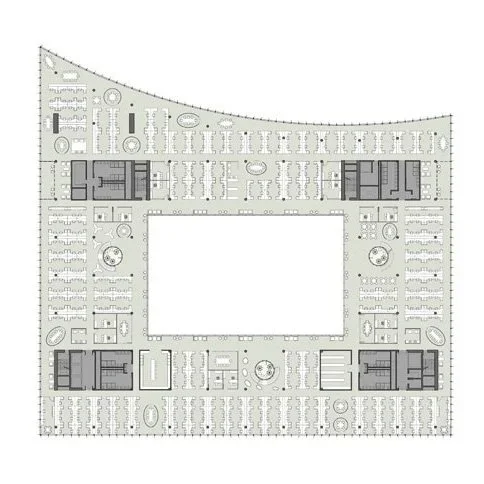 Inside the building, a mezzanine level contains the IT center, an executive dining room, and office spaces. A gently curved, floating volume that seems to hover above the ground level provides further office space, the central programmatic component of the project, and appears to embrace the adjacent park. This facade, composed of a continuous skin of glass, metal fins, and rolling shades, reinforces the volume’s lithe form. Taken together, the building’s separate components combine into a monumental expression of the bank’s transparent, democratic, and modern identity.