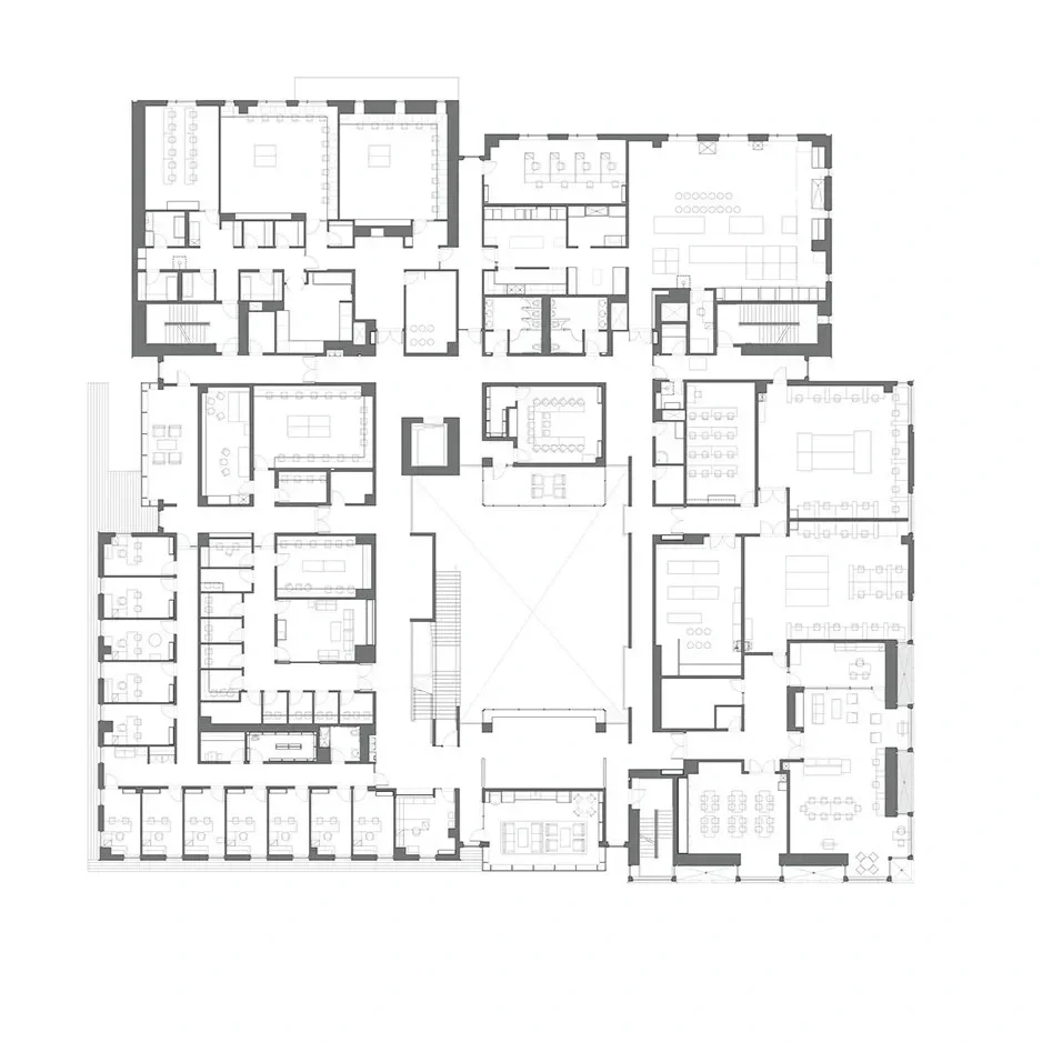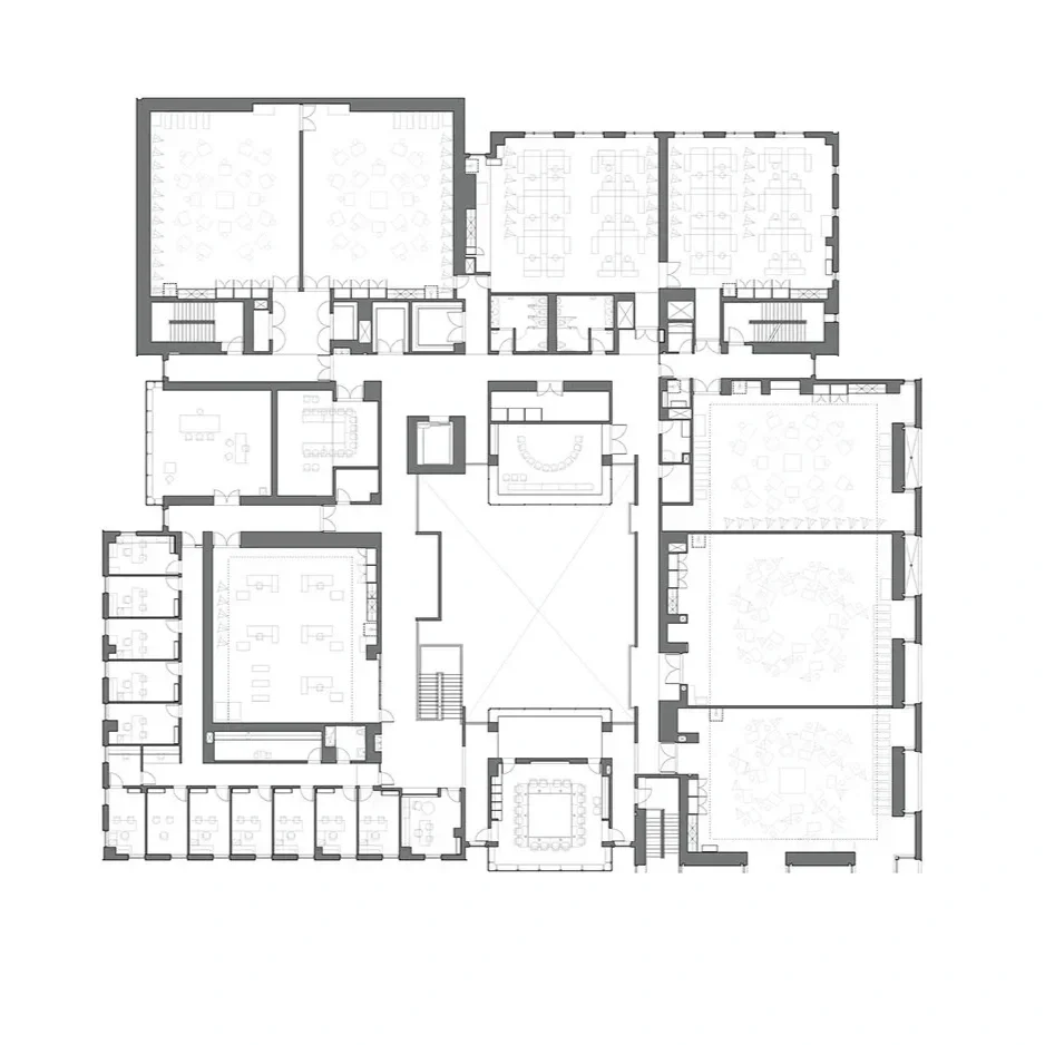 At the heart of the Visual Arts Center lies the Arts Forum, a three-story central atrium that brings light and air into the core of the urban block. Surrounding the space, teaching spaces and studios are organized into discrete program neighborhoods that open to the Arts Forum on all three levels, and, in doing so, promoting cross-disciplinary interaction and the collegial sharing of ideas.
