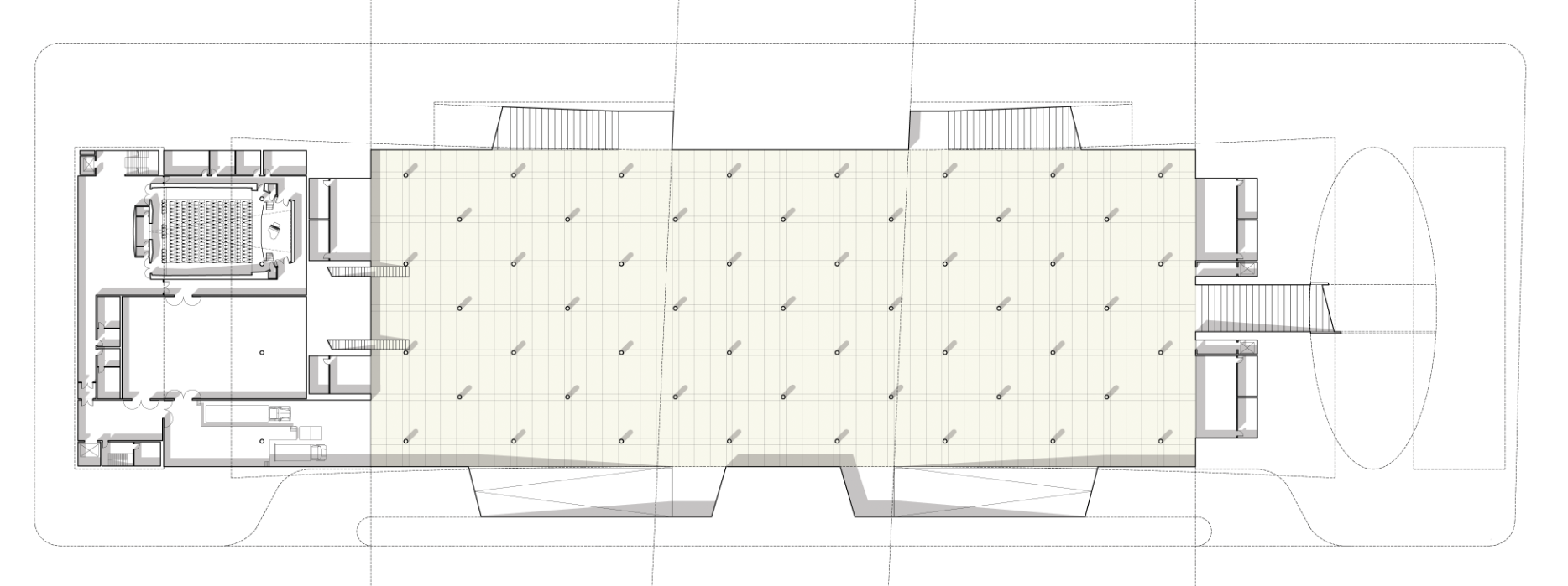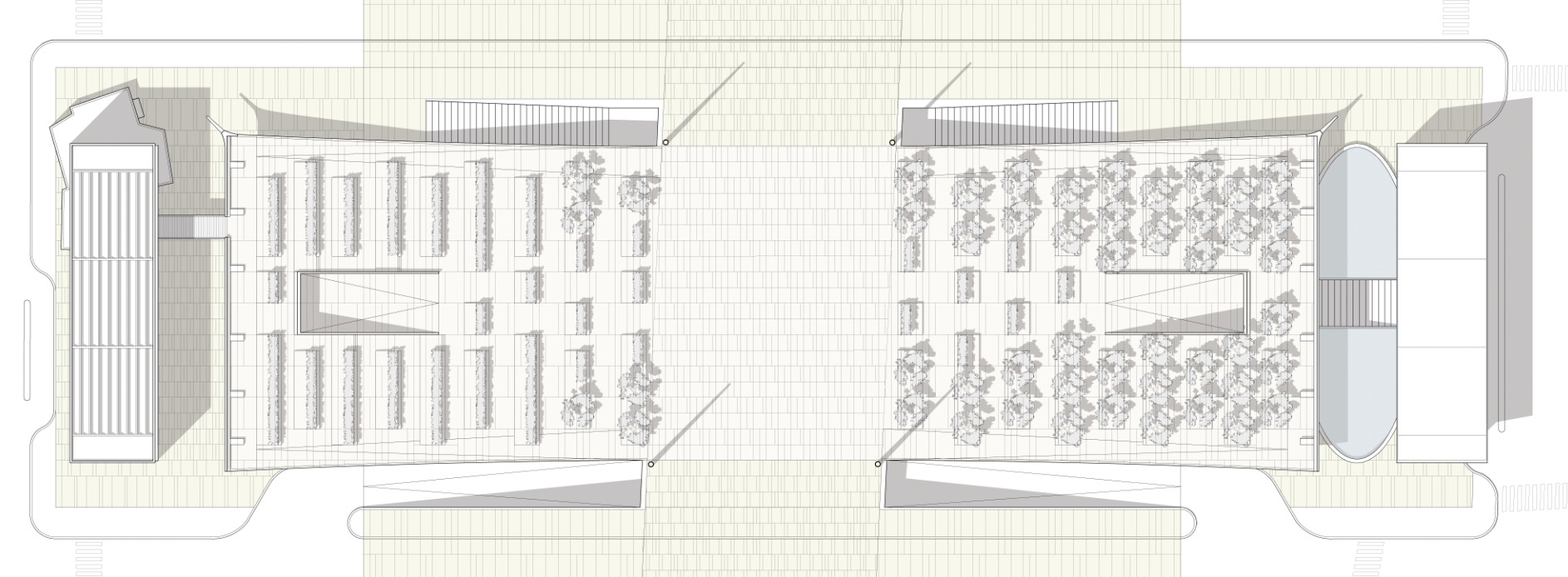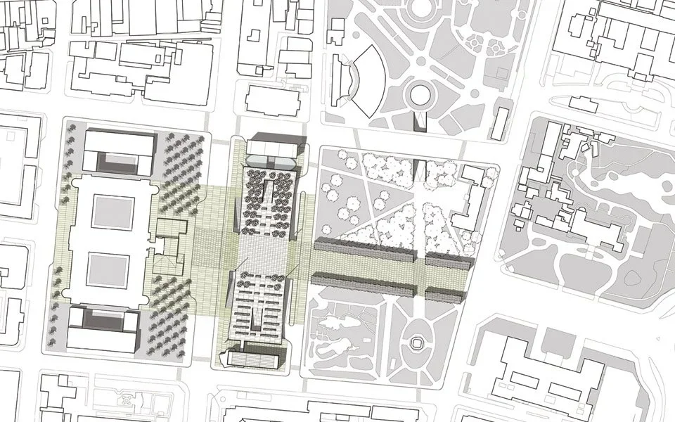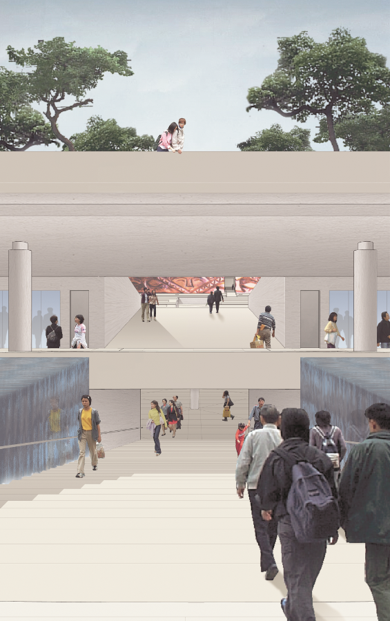 The project envisions the Capital Plaza as a monumental civic square: a plane five hundred seventy one-feet long by one hundred seventy-seven feet wide, rising up to twenty feet at both ends. The Capital Hall lies beneath the plaza, functioning as a hypostyle public space with an open-air shaded room supporting flexible programming. The proposal also includes a Palace Museum, public loggia, fountain, and cafés under the plaza eaves, topping out a public plaza like none other in the city.
