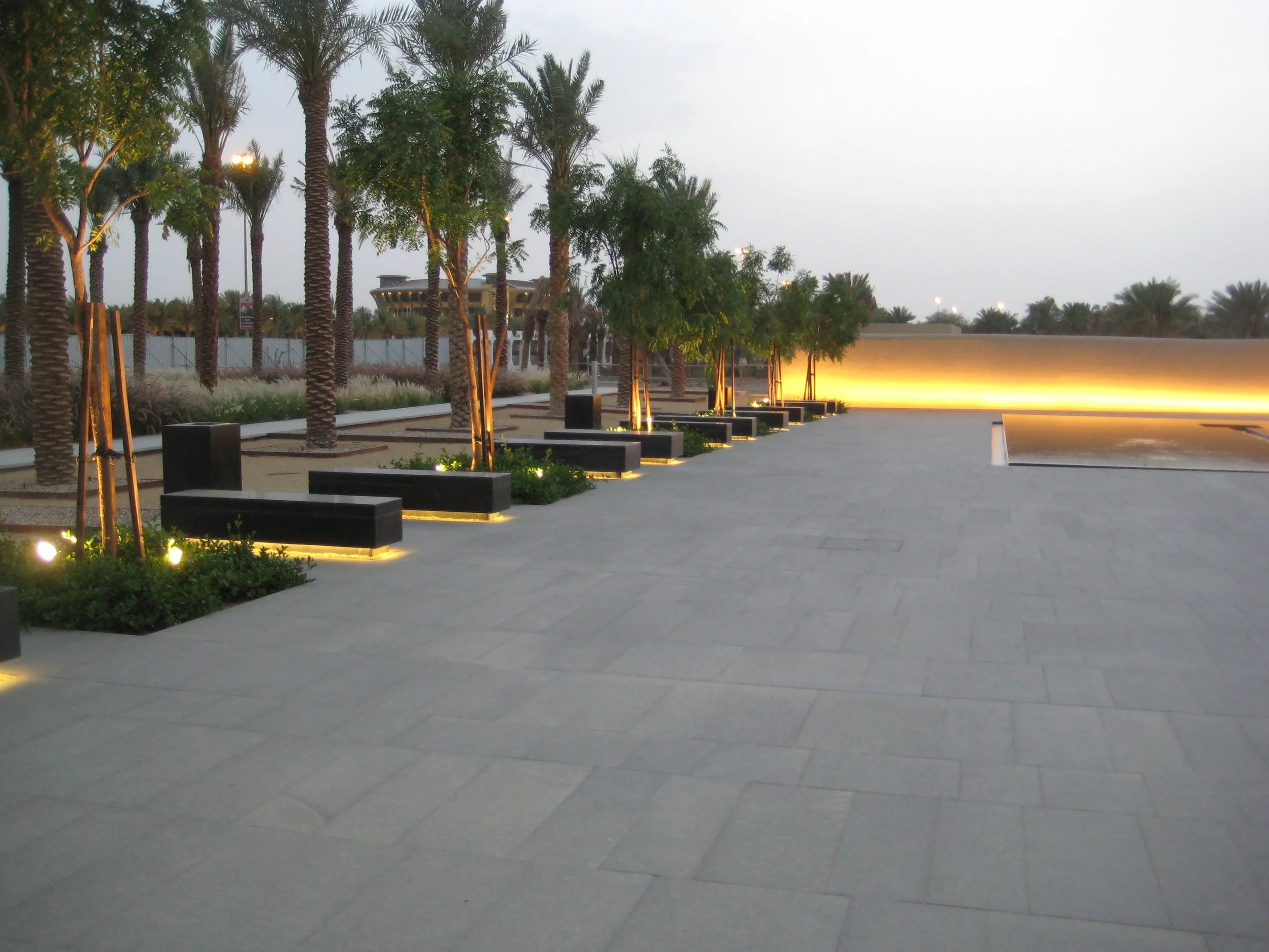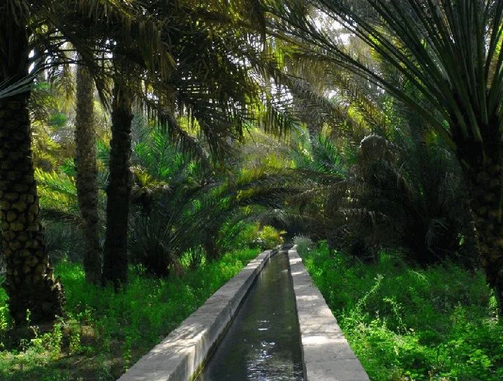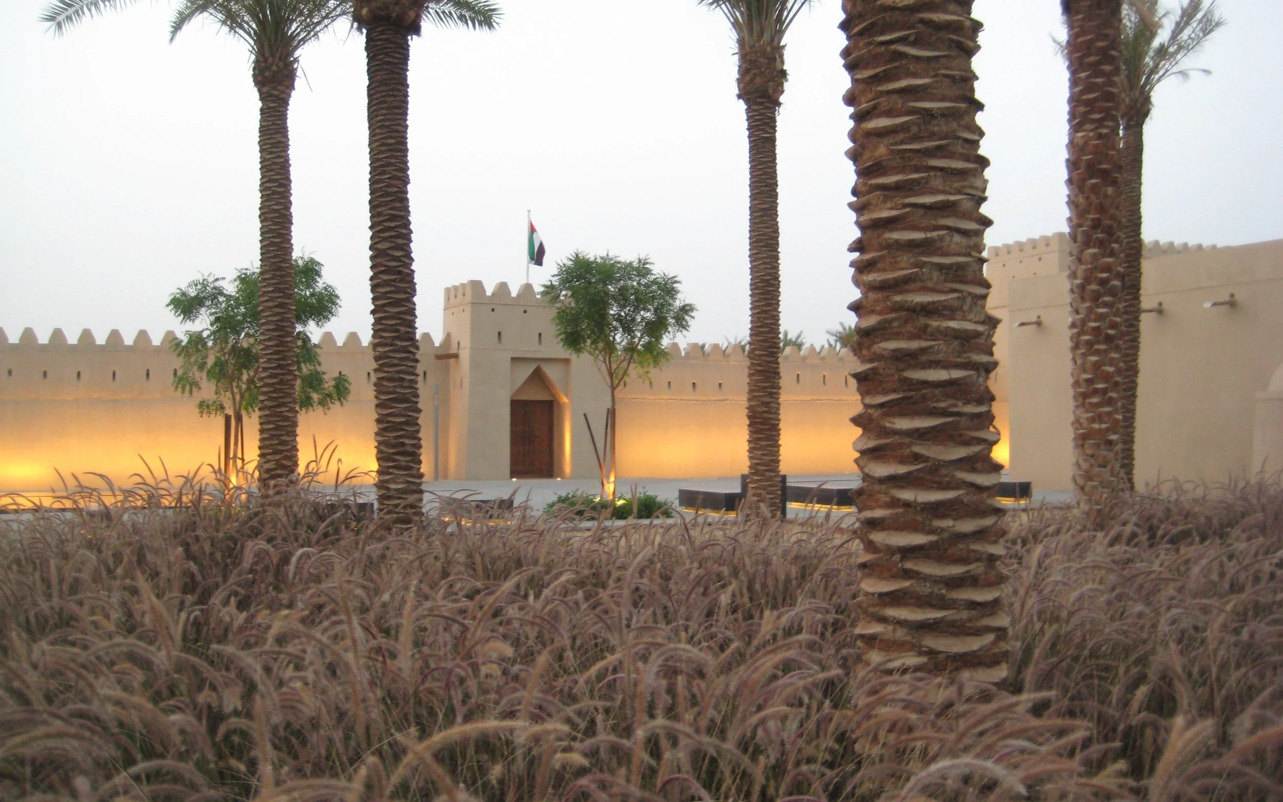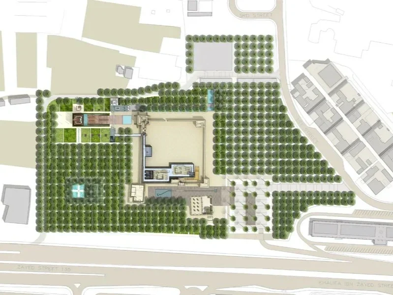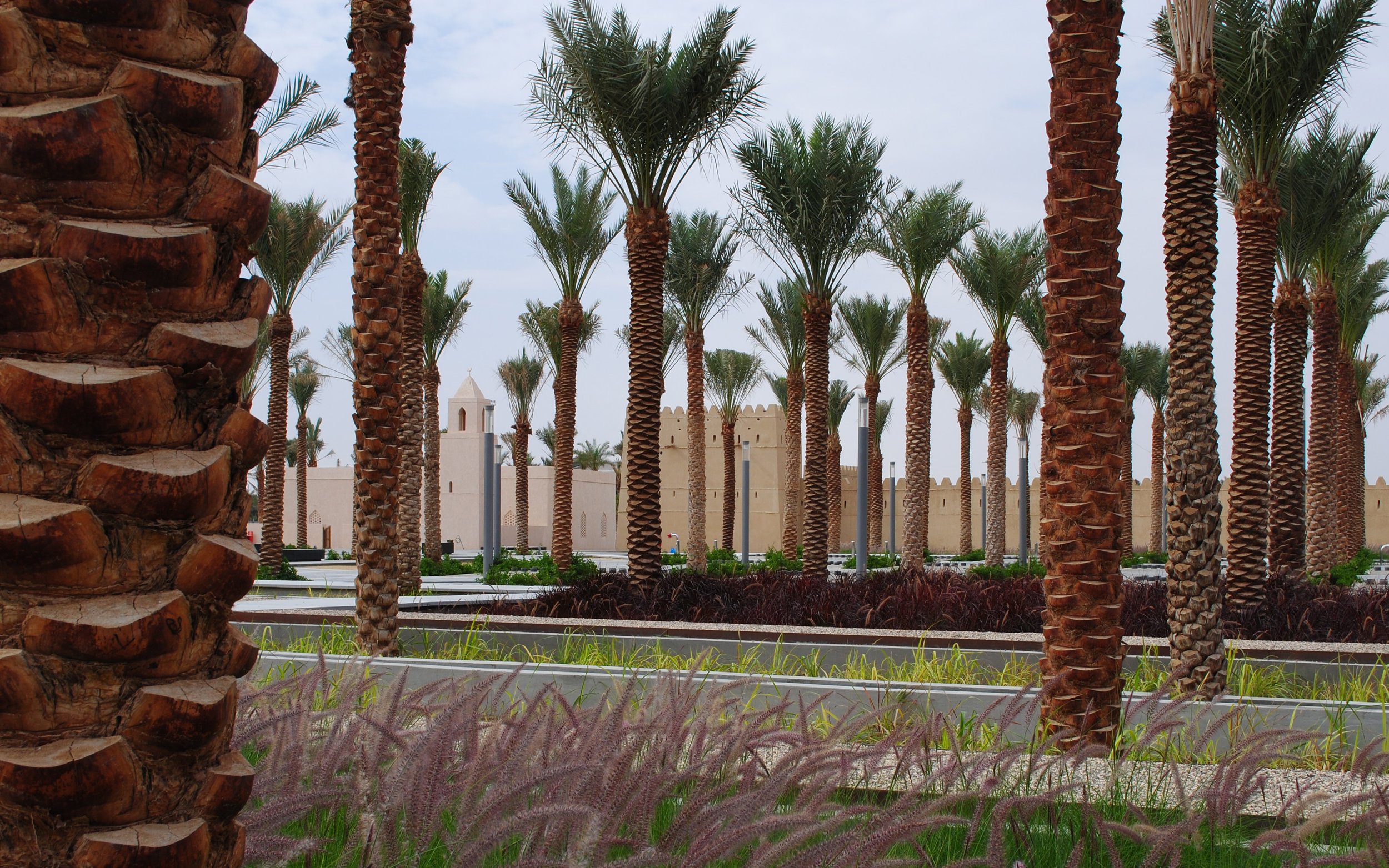 The complex offers uninterrupted access to a vast garden set under a continuous tree canopy and includes a range of amenities: fountains, pedestrian plazas, and shaded parking. The preserved date palm grove is irrigated by an active falaj system that harkens to the traditional farming practices of the area.