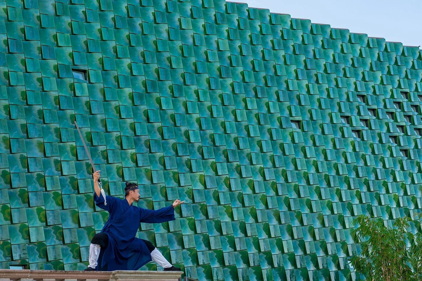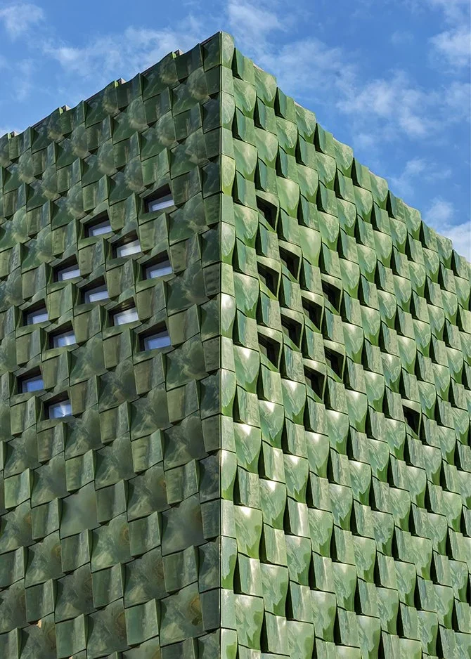 The addition’s façade features over 3,000 custom deep-green glazed terra cotta tiles, forming a new monumental entrance. The color and chiseled texture of the tiles nod to the ceramic ornamentation of the nearby Cà d’Zan mansion and the surrounding lush landscape.