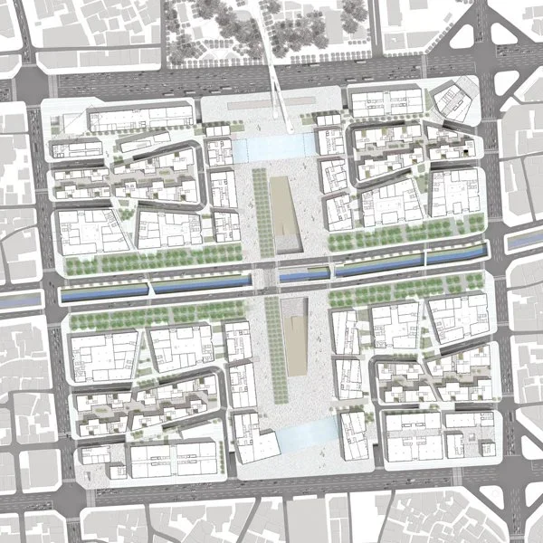 Exceptional, recognizable buildings mark each of the site’s four corners and draw their forms from existing local typologies. The effect is that of familiarity, an urban fabric reminiscent of the existing neighborhood conditions: angular pedestrian paths, visual tightness, and a continuous commercial ground plane. The plan ensures cultural continuity while also providing something entirely new.