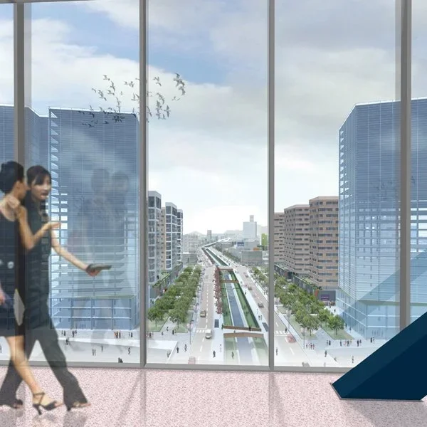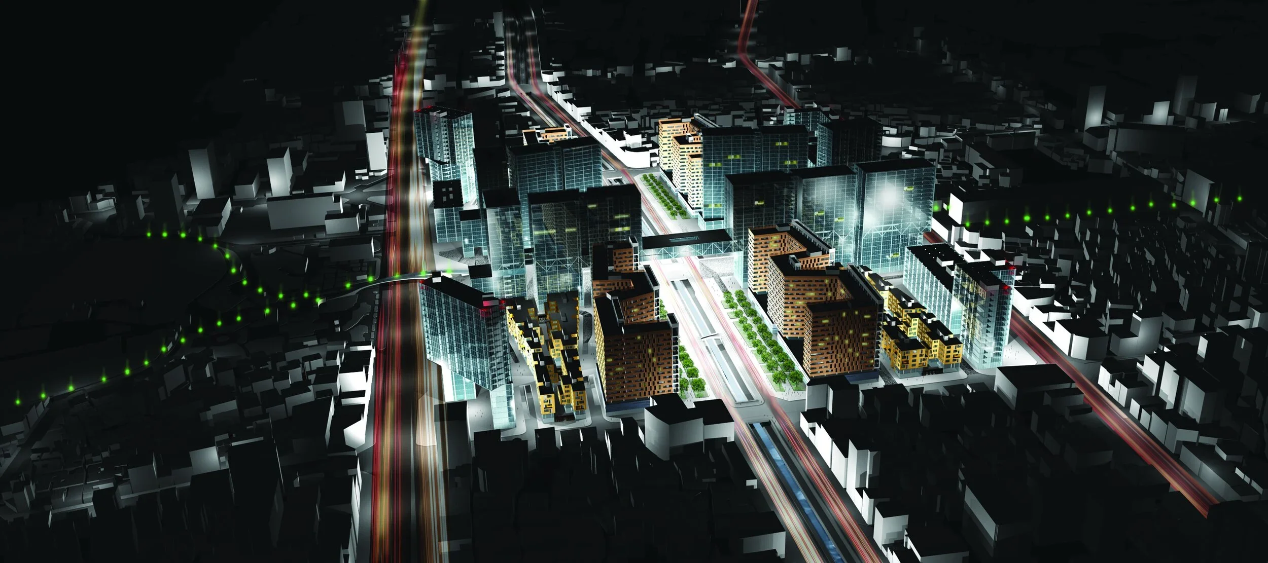 Three major building types come together to produce the city fabric: a twenty-four-story double-loaded office/retail/residential tower; an eighteen-story single-loaded apartment block; and an eight-story residential building that houses retail on the bottom two floors.