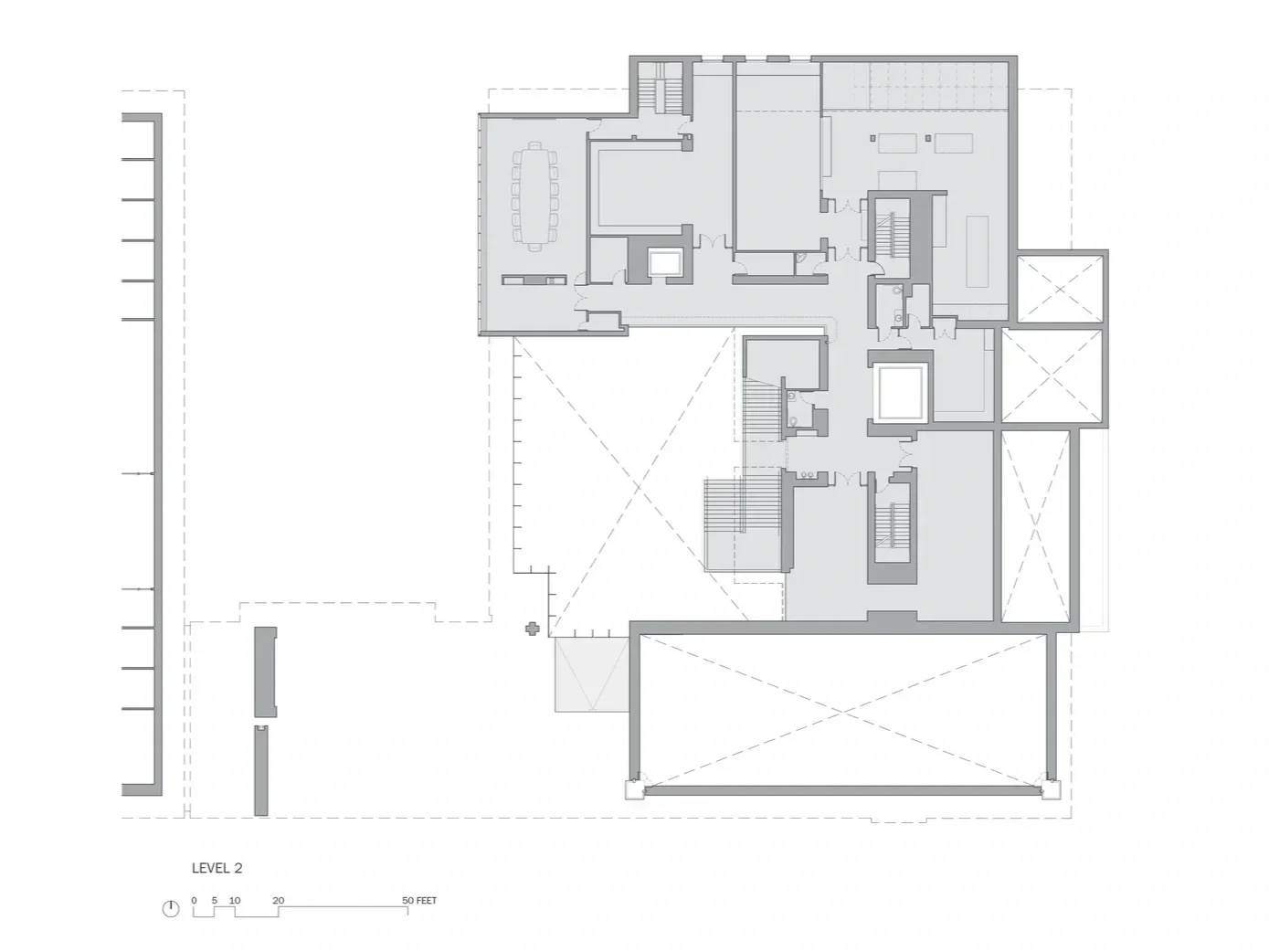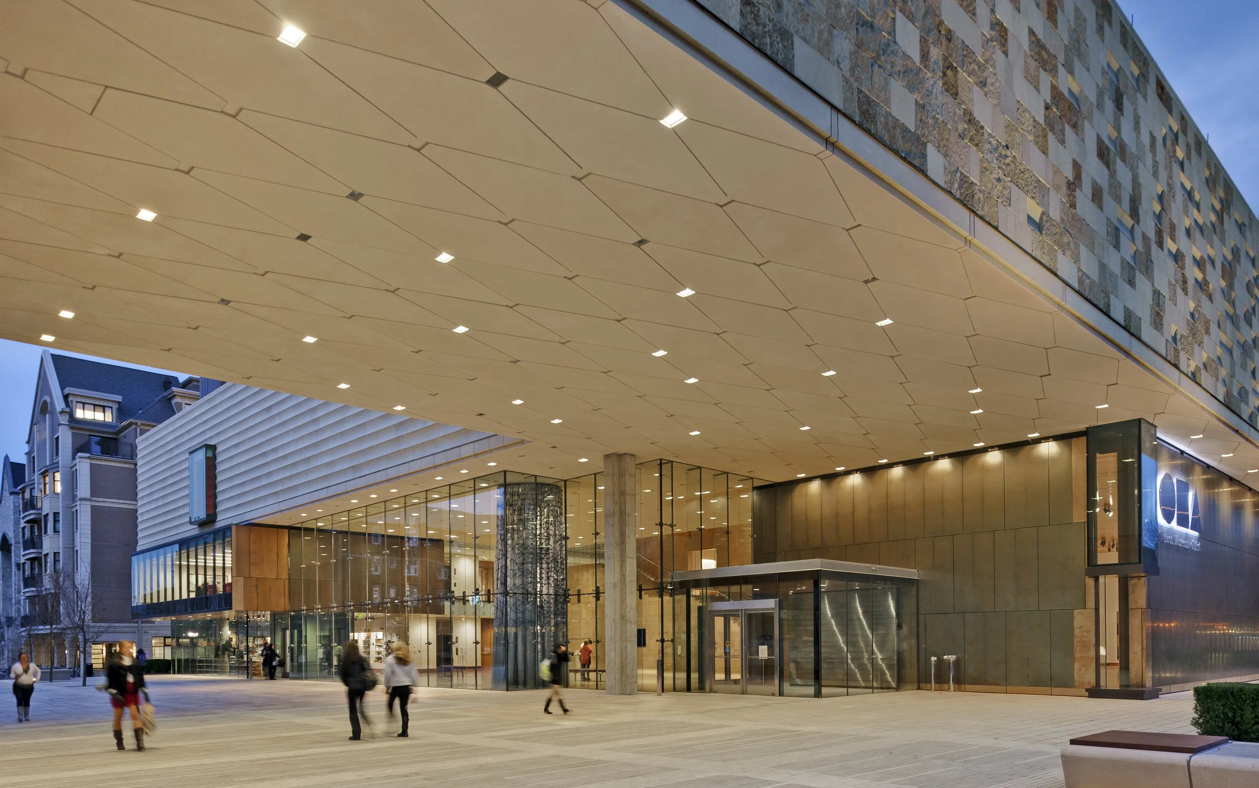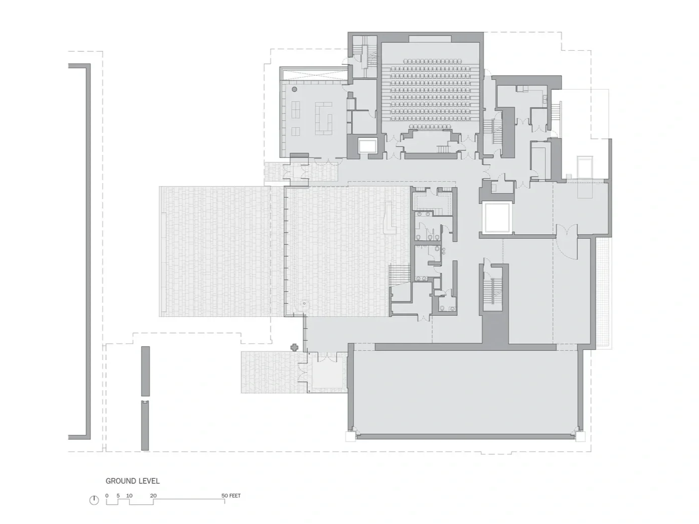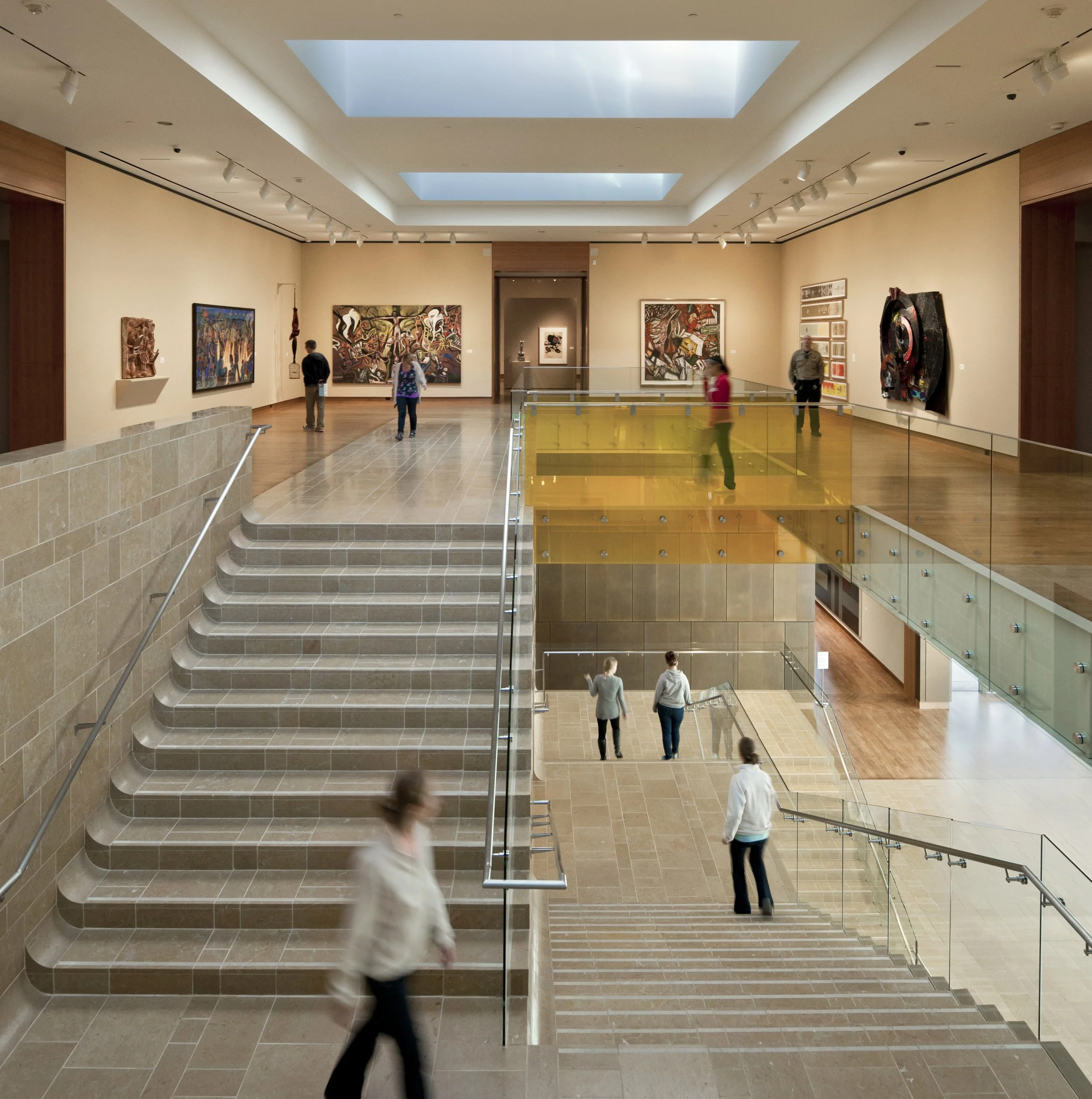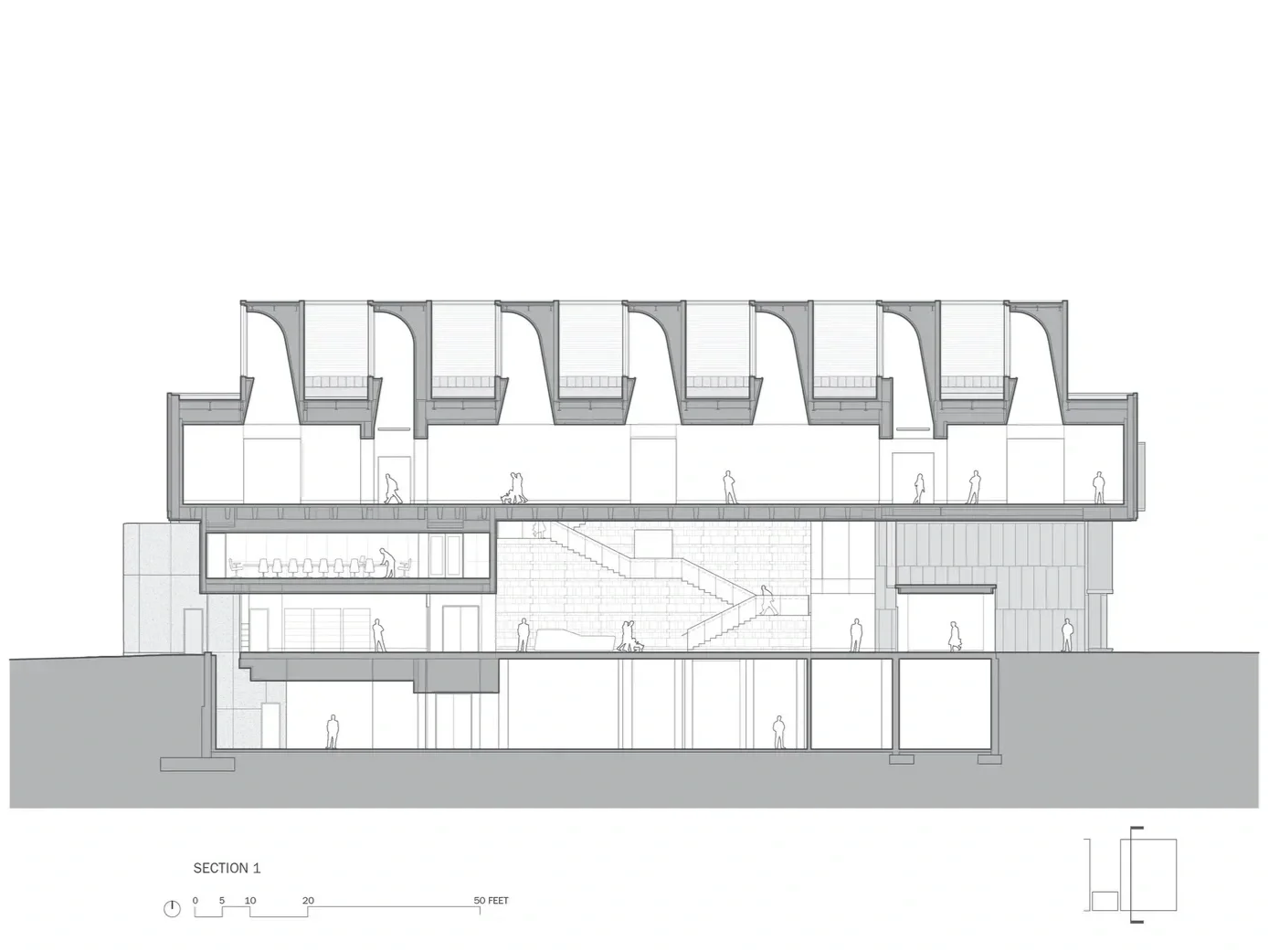 A series of projected and receded boxes—made from bronze/copper plate, board-formed concrete, and glass—define the first and second levels. The public lobby, a two-story glass volume that orients itself toward a significant courtyard space along a portion of the East Campus Mall, makes the new museum entrance visible from both the pedestrian mall and University Avenue. Collaborator Inside/Outside designed the translucent lobby curtain and auditorium stage curtain. Centered in the lobby, the main stair is a continuous band of stone veneer—a carpet that climbs and folds to define the different elements and spaces. Copper-clad monitors make up the roofscape and bring natural light deep into the museum.