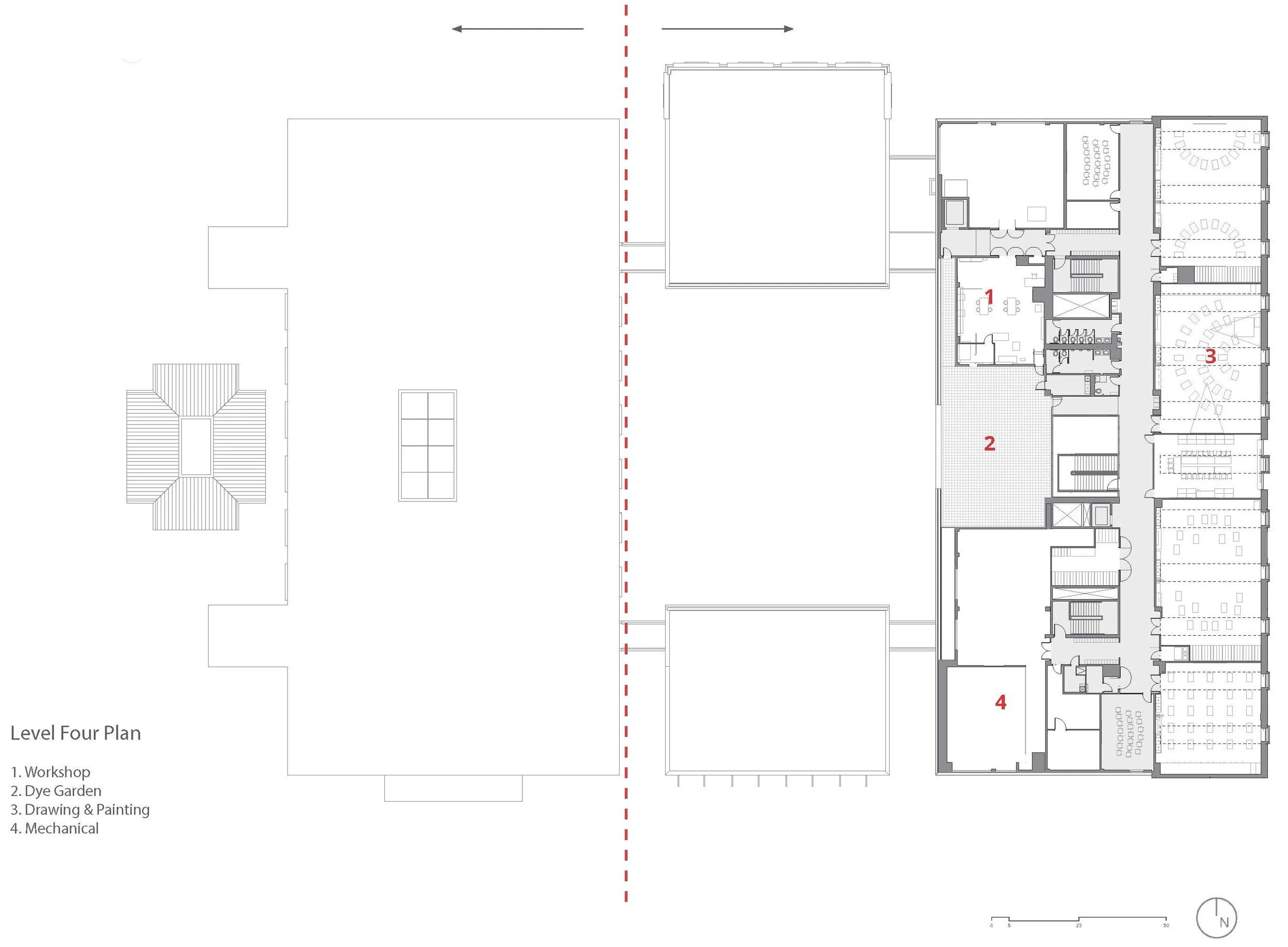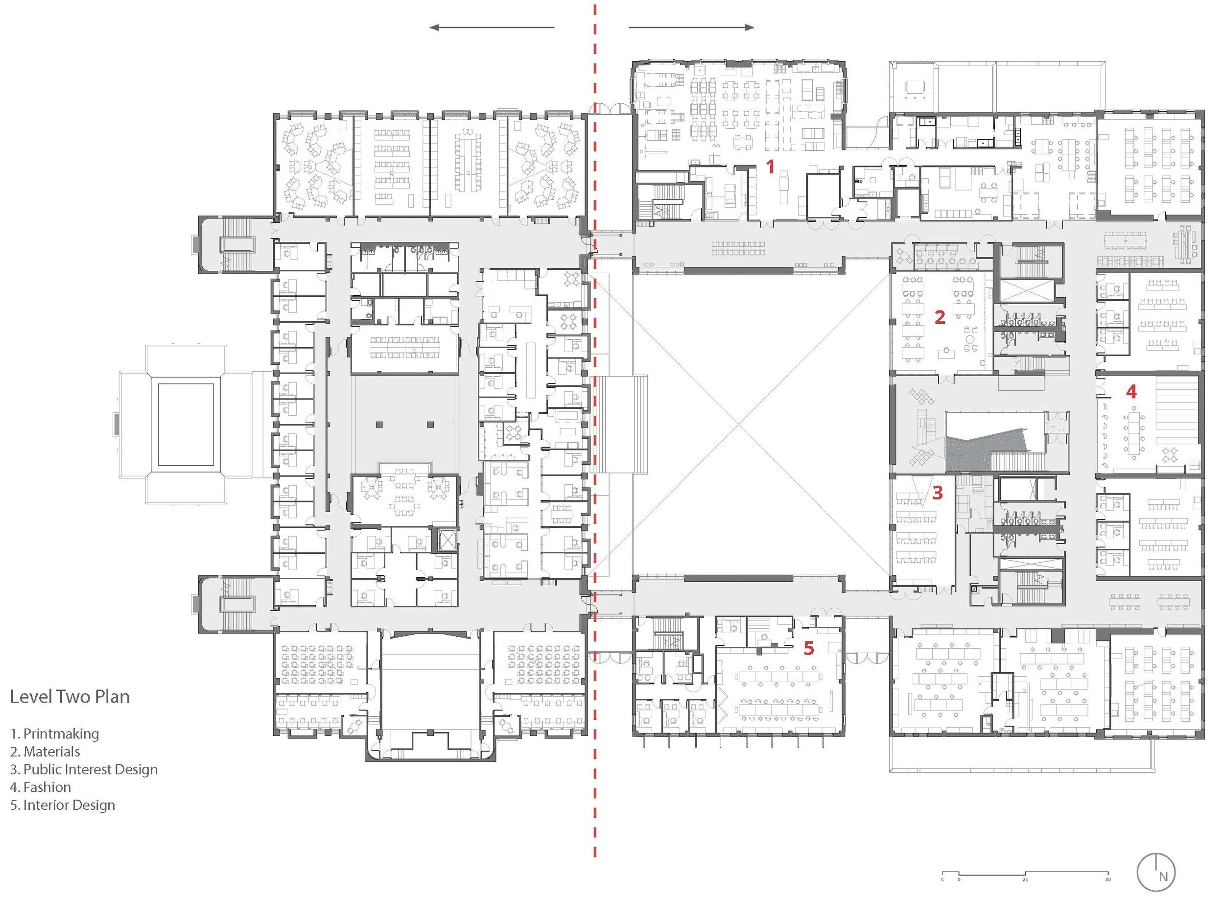 For such a large building tasked with holding nearly the entire CVAD program and providing the needed space and technologies for these departments, while simultaneously promoting a sense of community and enabling opportunities for collaboration, it was paramount to have a clear set of organizing principles. Circulation alignments, framed long views along corridors between the east and west, and common views of the shared courtyard unify the building. The primary east-west corridors act as Main Streets on each floor, with generous views into classrooms and studio spaces, and areas within these wide corridors that can be used as pin-up/critique spaces. Continuity in lighting, systems controls, finishes, furniture and equipment all help to reinforce this blurring of new and old.