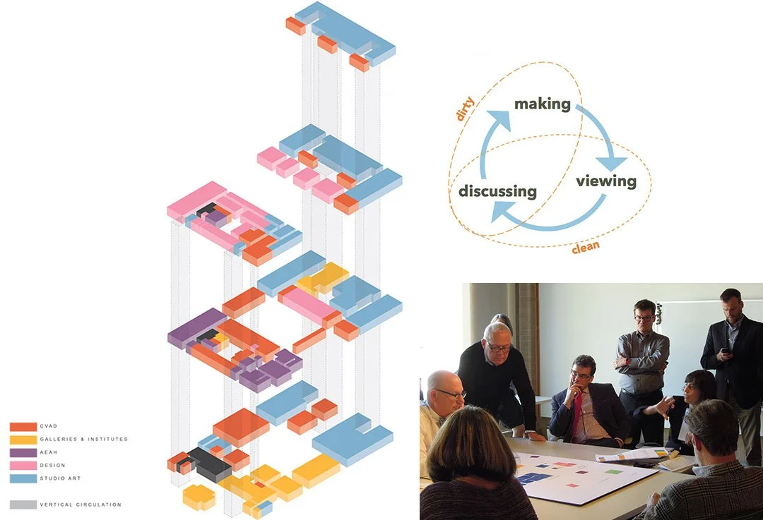 Clockwise from Left: Preliminary Programming Diagram; Space planning diagram for the phases of the creative process; Photo of a programming workshop, led by Machado Silvetti, with CVAD leadership and staff