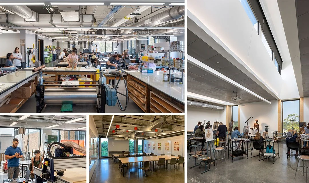 Views of a selection of the many types of classrooms, studios and maker spaces included in the CVAD building, Clockwise from Top: Printmaking studio; Drawing Studio featuring natural light from the Eastern addition monitors; Classroom with pin-up space in the renovated building (photo by Machado Silvetti); Fabrication workshop. All photos, except where noted, by Anton Grassl
